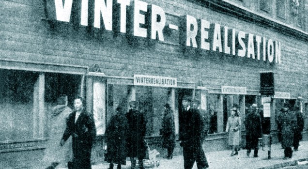 Boarded-up shop display windows in wartime Stockholm. The city was felt to be in danger of bombing raids. The worst that happened was an accidental raid by Russian bombers which hit a suburb in 1944 – ironically during a black-out exercise.